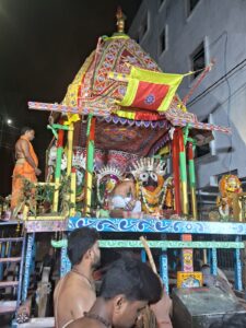 ଶ୍ରୀଜୀଉମାନେ ବକ୍ତାରପୁରସ୍ଥିତ ମାଉସୀମା ମନ୍ଦିରରୁ ସୋମବାର ବାହୁଡା ଯାତ୍ରାରେ ଆସିବା ପରେ ଚତୁର୍ଦ୍ଧା ମୂର୍ତିଙ୍କୁ ନେଇ ଆସିଥିବା ନନ୍ଦିଘୋଷଙ୍କ ପ୍ରତୀକ ରଥ ପତିତପାବନ ମନ୍ଦିର ସମ୍ମୁଖରେ ଅଟକିଥିଲା । ଆଜି ସକାଳୁ ଶ୍ରୀଜୀଉମାନଙ୍କ ମଙ୍ଗଳା ଆଳତୀ, ବାଳଧୂପ, ନୈବିଦ୍ୟ ଓ ସମସ୍ତ ନୀତିକାନ୍ତି ବୈଦିକ ରୀତିନୀତିରେ ସଂପନ୍ନ ହୋଇଥିଲା । ମଧ୍ୟାହ୍ନ ଧୂପ ପରେ ରଥ ଉପରେ ଶ୍ରୀଜୀଉମାନଙ୍କ ପହୁଡ ପଡିଥିଲା । ସଂନ୍ଧ୍ୟା ୭ଟା ସମୟରେ ଶ୍ରୀଜୀଉମାନଙ୍କୁ ସୁନାବେଶରେ ସଜ୍ଜିତ କରାଯାଇଥିଲା । ପତିତପାବନ ମନ୍ଦିର ପରିଚାଳନା କମିଟି ସଭାପତି ପୂର୍ଣ୍ଣ ଚନ୍ଦ୍ର ଦାଶ, ସଂପାଦକ ନରହରି ଲେଙ୍କା, ତ୍ରୈଲୋକ୍ୟ ମିଶ୍ର ପତିତପାବନଙ୍କ ମୁଖ୍ୟପୂଜକ ପର୍ଶୁରାମ ଦାଶ, ପୂଜକ ସନ୍ତୋଷ କୁମାର ଦାଶ, ଦଇତାପତିଙ୍କ ତତ୍ୱାବଧାନ ପ୍ରଭୁ ଚତ୍ରୁର୍ଦ୍ଧାମୂର୍ତିଙ୍କୁ ସୁନାବେଶରେ ସଜ୍ଜିତ କରିଥିଲେ । ରଥ ଉପରେ ପତିତପାବନଙ୍କ ସୁନାବେଶ ଦେଖିବାକୁ ପଟ୍ଟାମୁଣ୍ଡାଇ ଓ ଆଖପାଖ ଅଚଂଳର ଶତାଧିକ ଭକ୍ତଙ୍କ ସମାବେଶ ହୋଇଥିଲା । ବଡମୂଳବସନ୍ତ-ନସିପୁରସ୍ଥିତ ଗୋପାଳ ଦାଶ ସ୍ମାରକୀ ସାଂସ୍କୃତିକ ସଂଗଠନ (ଗଡମେକର) ପକ୍ଷରୁ ସଭାପତି ସୁଶାନ୍ତ କୁମାର ପାଣିଙ୍କ ସଂଯୋଜନାରେ କଳାକାରମାନେ ଭକ୍ତି ସଂଗୀତ ପରିବେଷଣ କରିଥିଲେ ।