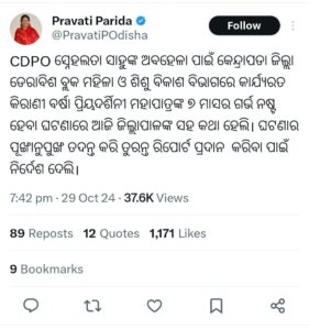 କେନ୍ଦ୍ରାପଡ଼ା,୨୯ା୧୦: କେନ୍ଦ୍ରାପଡା ଜିଲ୍ଲା ଅଧିନ ଡେରାବିଶ ବ୍ଲକର ସମନ୍ୱିତ ଶିଶୁ ବିକାଶ ଯୋଜନା କାର୍ଯ୍ୟାଳୟ(ଆଇସିଡିଏସ)ର ଜଣେ ଗର୍ଭବତୀ ମହିଳା କର୍ମଚାରୀ(କିରାଣୀ) ବର୍ଷା ପ୍ରିୟଦର୍ଶିନୀ ମହାପାତ୍ରଙ୍କୁ ଶିଶୁ ବିକାଶ ପ୍ରକଳ୍ପ ଅଧିକାରୀ(ସିଡିପିଓ)ଙ୍କ ନିର୍ଯାତନା ଯୋଗୁଁ ପିଡିତାଙ୍କର ଗର୍ଭସ୍ଥ ଶିଶୁର ମୃତ୍ୟୁ ହୋଇଯାଇଥିବା ଘଟଣା ଏବେ ସମଗ୍ର ରାଜ୍ୟରେ ଆଲୋଡନ ସୃଷ୍ଟି କରିଥିବାରୁ ଜିଲ୍ଲାପାଳ ଏହାର ତଦନ୍ତ ନିର୍ଦ୍ଦେଶ ଦେଇଛନ୍ତି। ଜିଲ୍ଲାପାଳ ସ୍ମୃତି ରଞ୍ଜନ ପ୍ରଧାନ କହିଛନ୍ତି ଯେ ଏ ସମ୍ପର୍କରେ ସେ ଗଣମାଧ୍ୟମରୁ ଜାଣିବା ପରେ ତୁରନ୍ତ ଏହାର ତଦନ୍ତ କରି ରିପୋର୍ଟ ପ୍ରଦାନ କରିବାକୁ ଜିଲ୍ଲା ସମାଜମଙ୍ଗଳ ଅଧିକାରୀ(ଡିଏସ୍ଡବ୍ଲ୍ୟୁଓ) ସ୍ନେହଲତା ସାହୁଙ୍କୁ ନିର୍ଦ୍ଦେଶ ଦେଇଛନ୍ତି। ଜିଲ୍ଲା ସମାଜମଙ୍ଗଳ ଅଧିକାରୀ କହିଛନ୍ତି ଏ ସଂକ୍ରାନ୍ତରେ ସେ ପିଡିତା ବର୍ଷା ପ୍ରିୟଦର୍ଶିନୀଙ୍କ ସହ କଥା ହୋଇ ସମସ୍ତ ବିଷୟ ବୁଝିଛନ୍ତି। ବର୍ଷା ତାଙ୍କୁ କାନ୍ଦି କାନ୍ଦି ସମସ୍ତ ଘଟଣା ବର୍ଣ୍ଣନା କରିଥିଲେ। ଏହା ଜାଣିବା ପରେ ସେ ସିଡିପିଓଙ୍କ କାର୍ଯ୍ୟାଳୟକୁ ଯାଇ ବର୍ଷାଙ୍କୁ କେଉଁଭଳି ଭାବେ ସିଡିପିଓ ନିର୍ଯାତନା ଦେଉଥିଲେ ସେ ସମ୍ପର୍କରେ ଅନ୍ୟ କର୍ମଚାରୀଙ୍କ ପାଖରୁ ପଚାରି ବୁଝିଥିଲେ। ବର୍ଷାଙ୍କର ଯାହା ଅବସ୍ଥା ଥିଲା ସେଭଳି ସ୍ଥିତିରେ କାର୍ଯ୍ୟାଳୟର କର୍ମଚାରୀ ଭାବେ ସିଡିପିଓ ତାଙ୍କୁ ମାନବିକତା ଦେଖାଇବା ବଦଳରେ ଓଲଟା ତାଙ୍କୁ ନିର୍ଯାତନା ଦେଇଥିଲେ। ଫଳରେ ବର୍ଷାଙ୍କର ଗର୍ଭସ୍ଥ ଶିଶୁଟିର ମୃତ୍ୟୁ ଘଟିଲା। ଏ ନେଇ ସବିଶେଷ ରିପୋର୍ଟ ସେ ଜିଲ୍ଲାପାଳଙ୍କୁ ପ୍ରଦାନ କରିବେ ବୋଲି କହିଛନ୍ତି। ଏ ସଂକ୍ରାନ୍ତରେ ପିଡିତା ବର୍ଷାଙ୍କୁ ସିଡିପିଓ କିଭଳି ନିର୍ଯାତନା ଦେଇଥିଲେ ଯାହାଫଳରେ ତାଙ୍କର ସାତ ମାସର ଗର୍ଭସ୍ଥ ଶିଶୁର ମୃତ୍ୟୁ ଘଟିଲା ତାହାର କରୁଣ କାହାଣୀ ପୀଡିତା ବର୍ଣ୍ଣନା କରିଛନ୍ତି । ପୀଡିତା ତାଙ୍କ ବୟାନରେ କହିଛନ୍ତି ଯେ ୨୦୨୧ ମସିହାରୁ ସେ ଏହି ବିଭାଗରେ ଜଣେ କନିଷ୍ଠ କିରାଣୀ ଭାବେ କାର୍ଯ୍ୟ କରି ଆସୁଛନ୍ତି। ଚାକିରୀ କରିବା ଦିନଠୁଁ ସିଡିପିଓ ସ୍ନେହଲତା ସାହୁ ସବୁ ସମୟରେ ତାଙ୍କୁ ନିର୍ଯାତନା ଦେଇଆସୁଛନ୍ତି। ଗତ ତିନିମାସ ହେବ ସିଡିପିଓ ତାଙ୍କୁ ବିଭିନ୍ନ ସମୟରେ ବେଆଇନ୍ କାର୍ଯ୍ୟ କରିବାକୁ ବାଧ୍ୟ କରୁଥିଲେ। ଏଥିସହିତ କାର୍ଯ୍ୟାଳୟ ଭିତରେ ତାଙ୍କୁ ଏକ ପ୍ରକାର ନଜରବନ୍ଦୀ କରି ରଖୁଥିଲେ। ଯେତେବେଳେ ତାଙ୍କ ଦେହ ଅସୁସ୍ଥ ହୁଏ ସିଡିପିଓଙ୍କୁ ସେ କହିଲେ ମଧ୍ୟ ସିଡିପିଓ କୁହନ୍ତି ତୁ ଏ ସ୍ଥାନରୁ କେଉଁଠିକୁ ଯାଇପାରିବୁ ନାହିଁ। ଯେଉଁ କାର୍ଯ୍ୟ ଦିଆଯାଇଛି ସେ କାର୍ଯ୍ୟ କେବଳ ଗୋଟିଏ ଜାଗାରେ ବସି କରିବୁ ବୋଲି ଧମକ ଦେଉଥିଲେ। ଗତ ୨୫ ତାରିଖରେ ସେ କାର୍ଯ୍ୟାଳୟରେ କାମ କରୁଥିବା ବେଳେ ପେଟର ଅସହ୍ୟ ଗର୍ଭ ଯନ୍ତ୍ରଣା ପାଇଥିଲେ । କିନ୍ତୁ ଏ ବିଷୟରେ ସିଡିପିଓଙ୍କୁ ବାରମ୍ବାର ବର୍ଷା କହିଥିଲେ ମଧ୍ୟ ସେ ତାଙ୍କ କଥାକୁ ଶୁଣି ନଥିଲେ । ପରିସ୍ଥିତି ଏପରି ହୋଇଥିଲା ସେ ଚୌକିରେ ବସି ଛଟପଟ ହେଉଥିବା ବେଳେ ସିଡିପିଓ କିନ୍ତୁ ନିଦାବିଷ୍ଣୁ ପାଲଟି ଯାଇଥିଲେ। କାର୍ଯ୍ୟାଳୟର କର୍ମଚାରୀଙ୍କଠାରୁ ଖବର ପାଇ ତାଙ୍କ ବାପା ଓ ଜଣେ ସମ୍ପର୍କୀୟ ଘଟଣାସ୍ଥଳରେ ପହଞ୍ଚିିଥିଲେ । କିନ୍ତୁ ତାଙ୍କ ବାପା ସିଡିପିଓଙ୍କୁ ଯେତେ ଅନୁରୋଧ କରିଥିଲେ ମଧ୍ୟ ସ