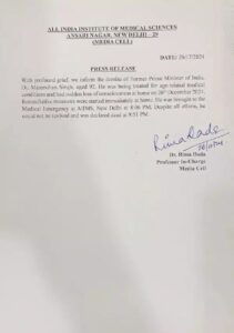 ନୂଆଦିଲ୍ଲୀ,୨୬/୧୨-ପୂର୍ବତନ ପ୍ରଧାନମନ୍ତ୍ରୀ ମନମୋହନ ସିଂଙ୍କ ଗୁରୁବାର ରାତିରେ ପରଲୋକ ହୋଇଯାଇଛି। ମୃତ୍ୟୁ ବେଳକୁ ତାଙ୍କୁ ୯୨ ବର୍ଷ ହୋଇଥିଲା। ସନ୍ଧ୍ୟାରେ ସେ ନିଶ୍ୱାସ ନେବାରେ କଷ୍ଟ ଅନୁଭବ କରିବାରୁ ତାଙ୍କୁ ଦିଲ୍ଲୀ ସ୍ଥିତ ଏମ୍ସରେ ଭର୍ତ୍ତି କରାଯାଇଥିଲା। ଗୁରୁବାର ସନ୍ଧ୍ୟା ପ୍ରାୟ ୮ଟାରେ ତାଙ୍କୁ ହସ୍ପିଟାଲରେ ଭର୍ତ୍ତି କରାଯାଇଥିବା ବେଳେ ରାତି ପ୍ରାୟ ୯ଟା ୫୧ରେ ସେ ଶେଷ ନିଶ୍ୱାସ ତ୍ୟାଗ କରିଛନ୍ତି।
