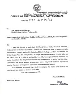 ପଟ୍ଟାମୁଣ୍ଡାଇ ୨୦/୩ -ପଟ୍ଟାମୁଣ୍ଡାଇ ତହସିଲ ଅନ୍ତର୍ଗତ ଅଣ୍ଢରା ରାଜସ୍ୱ ନିରୀକ୍ଷକଙ୍କ କାର୍ଯ୍ୟାଳୟକୁ ମଙ୍ଗଳବାର କେତେକ ଦୁର୍ବୁତ ପସି ରାଜସ୍ୱ ନିରୀକ୍ଷକଙ୍କୁ ମରଣାନ୍ତଙ୍କ ଆକ୍ରମଣ କରିବା ସହିତ ଆଲମିରାରେ ଥିବା ୨୪ ହଜାର ୩୪୮ ସରକାରୀ ଅର୍ଥ ନେଇ କାଗଜପତ୍ରକୁ ଏଣେତେଣେ ଫୋପାଡି ଦେଇଛନ୍ତି ବୋଲି ଆରଆଇ ମନୋଜ କୁମାର ମଲିକ ପଟ୍ଟାମୁଣ୍ଡାଇ ତହସିଲଦାରଙ୍କୁ ଲିଖିତ ଅଭିଯୋଗ କରିଛନ୍ତି। ଅଭିଯୋଗକୁ ଭିତି କରି ପଟ୍ଟାମୁଣ୍ଡାଇ ତହସିଲଦାର ପଂଚାନନ ନାୟକ ଏକ ଚିଠି ନଂ-୧୭୬୦/୧୯-୦୩-୨୦୨୫ରେ ପଟ୍ଟାମୁଣ୍ଡାଇ ଆଦର୍ଶ ଥାନା ଅଧିକାରୀଙ୍କୁ ଆବଶ୍ୟକ ପଦକ୍ଷେପ ଗ୍ରହଣ ନିମନ୍ତେ ସୁପାରିଶ କରିଥିବା ଜଣାପଡିଛି। ଘଟଣାକୁ ନେଇ ପଟ୍ଟାମୁଣ୍ଡାଇ ଆଦର୍ଶ ଥାନା ଆଇଆଇସି ବନ୍ଦନା ପାତ୍ର ଭାରତୀୟ ନ୍ୟାୟ ସଂହିତା ଅନୁଯାଇ ତଦନ୍ତ ଚଳାଇଥିବା କହିଛନ୍ତି ।